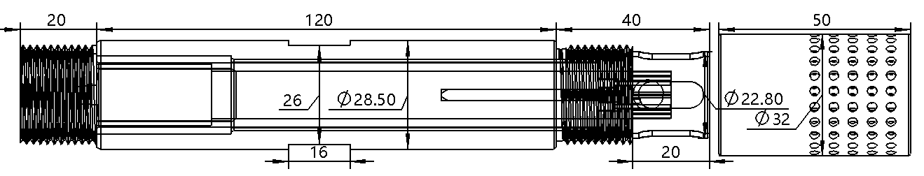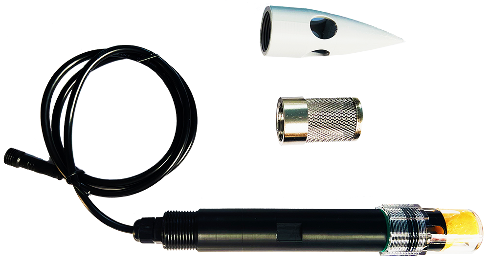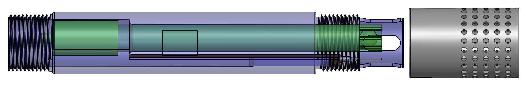 传感器结构如下图所示,绿色的为基于Ag/AgCl耐有机溶剂腐蚀的电化学玻璃球泡复合电极pH敏感探头,下面集成了测量电导率及温度导热敏感的合金金属探针。外壳材质为PPS-CF(聚苯硫醚+碳纤维增强),力学、热性能、耐化学腐蚀性极优,头部和尾部都有G3/4管螺纹。玻璃电极采用聚碳酸酯材质外壳的密封设计,使用氟胶密封圈,具有IP68的防水等级。过滤盖内置100目孔径0.18mm的不锈钢过滤网,可滤除微小颗粒物。